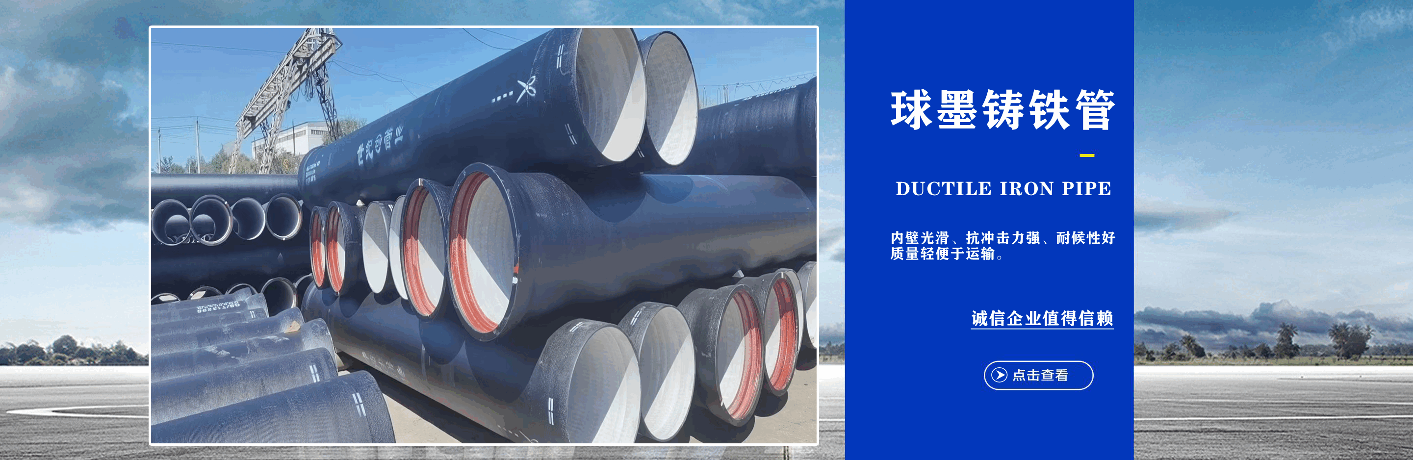 青島世紀球墨鑄鐵管業(yè)有限公司主營DN80mm~DN2600mm球墨鑄鐵管,給排水球墨鑄鐵管,球墨鑄鐵頂管,自錨式球墨鑄鐵管,球墨鑄鐵保溫管,球墨鑄鐵管件,柔性排水鑄鐵管,球墨鑄鐵井蓋,雨篦子等產(chǎn)品。我公司實力雄厚,常備萬噸庫存,貨源充足,規(guī)格齊全,發(fā)貨速度快! 青島世紀管業(yè)嚴格執(zhí)行“精益求精,增強顧客滿意;精益求進,實現(xiàn)持續(xù)發(fā)展”的質(zhì)量方針,建立起完善的售前咨詢、售中安裝、售后回訪服務體系,真誠地與用戶建立起長期密切合作關系。優(yōu)異的產(chǎn)品和良好服務受到廣大用戶的青睞,是您值得尊敬和信賴的合作伙伴。 青島世紀球墨鑄鐵管業(yè)始終堅持“誠信立業(yè),追求卓越,合作共贏,共同發(fā)展”,竭誠歡迎各界朋友來廠參觀指導,洽談業(yè)務。我們愿與您攜手共進,互惠雙贏,共創(chuàng)未來!...